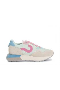 Mehrfarbige laufschuhe mit schnürung aus stoff und wildleder. besondere 4-cm-mehrfarbensohle. super bequemer und praktischer schuh geeignet für alltagsoutfits.