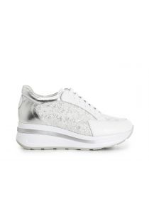 Sneaker leder mit eleganten laminierten einsätzen in spitzenoptik. zweifarbige 40-mm-keilsohle mit geprägtem logo.