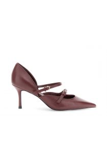 Lederpumps mit doppelten Riemchen und einem 7,5 cm hohen, schmalen Absatz. Die schmal zulaufenden Linien und die goldenen Details verleihen ihnen eine elegante, feminine Silhouette mit zeitloser Ausstrahlung.