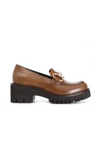 Damen-mokassin aus leder mit goldfarbener spange. der absatz ist 55 mm hoch. bequeme innensohle aus leder. profilsohle.