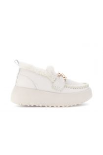 Weiße Lederslipper mit goldfarbenen Beschlägen. Futter und Innensohle aus Kunstfell. Bequem und warm, mit 4 cm hohem Plateau. Perfekt für elegante Winter-Looks.