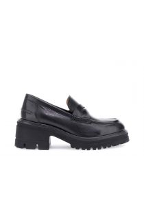 Elegante Loafer aus gebürstetem Leder mit Schnalle vorne. Lederfutter und -innensohle. Profilsohle mit 5,5 cm Absatz und 2,5 cm Plateau. Ideal für einen stilvollen und trendigen Look, perfekt für die Stadt.