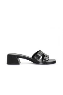 Lederpantoffel mit schmuckaccessoire. futter und innensohle sind aus leder. quadratische form. der absatz beträgt 4.5 cm.