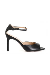 Elegante ledersandale mit knöchelriemen und patch auf der rückseite. futter und bequeme innensohle sind aus leder. 8.5 cm hoher absatz mit konischer form. ein zeitloser klassiker der in ihrer garderobe nicht fehlen darf.