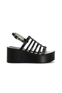 Ledersandalen mit hohem Keilabsatz und flachem Band mit Käfigeffekt