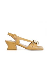 Asymmetrische ledersandalen mit goldketten-accessoire und gewagtem dickem trichterabsatz.