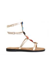 T-förmige flip-flop-sandalen aus leder mit verzierten steinen. futter und innensohle sind aus leder. schuh mit leicht abgerundeter form. der absatz beträgt 2.5 cm.