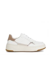 Damen-sneaker aus bezogenem leder mit laminierten einsätzen. die innensohle ist aus leder.