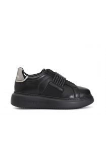 Sneaker aus leder mit glitzer- und laminierten einsätzen. elastische strass-mikro-riemchen bereichern und verschönern den schuh und erleichtern das anziehen. bei der sohle handelt es sich um eine schalensohle die innensohle ist aus leder.