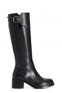 Damenstiefel aus leder mit dekorativer schnalle und nietenmotiv auf dem stiefelschaft. der absatz ist 50 mm hoch. die innensohle ist aus leder gefertigt.