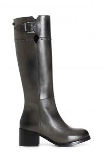 Damenstiefel aus leder mit dekorativer schnalle und nietenmotiv auf dem stiefelschaft. der absatz ist 50 mm hoch. die innensohle ist aus leder gefertigt.