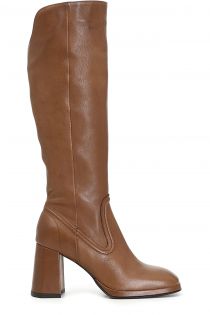 Lederstiefel mit weitem Schaft und eckiger Spitze. Mittelhoher, farblich abgesetzter Absatz.