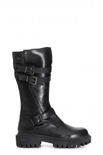 Damenstiefel aus leder verziert mit einem geflecht aus schnallen. die innensohle ist aus leder gefertigt. die profilsohle aus extra-leichtem material verschlankt die linien und macht den schuh hochmodern.