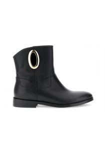 Elegante Damen-Ankle-Boots aus Leder mit goldfarbenem, ovalem Accessoire, Textilfutter und Lederinnensohle. 2,7 cm Absatz. Elegant und bequem – perfekt für einen raffinierten Look.