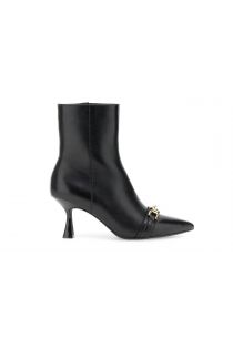 Stiefeletten aus Leder mit goldfarbenem Clip. Spitz zulaufende Zehenpartie, 7,5 cm hoher Blockabsatz und Lederinnensohle. Eleganz und Komfort für einen femininen und raffinierten Look.