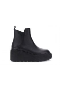Schwarze Leder-Ankle-Boots mit seitlichem Reißverschluss. Minimalistisches Design und eine 7,5 cm hohe Plateausohle mit 4 cm hohem Keilabsatz für einen bequemen und modernen urbanen Look. Lederfutter.