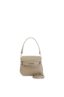 lederüberschlag mit kurzem schulterriemen, schlaufe mit schriftzug taupe