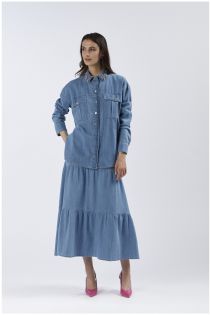 Gerades hemd mit aufgesetzten taschen und langen ärmeln aus bequemem denim. der kragen ist mit einer exklusiven reichen stickerei aus mehrfarbigen strasssteinen verziert.