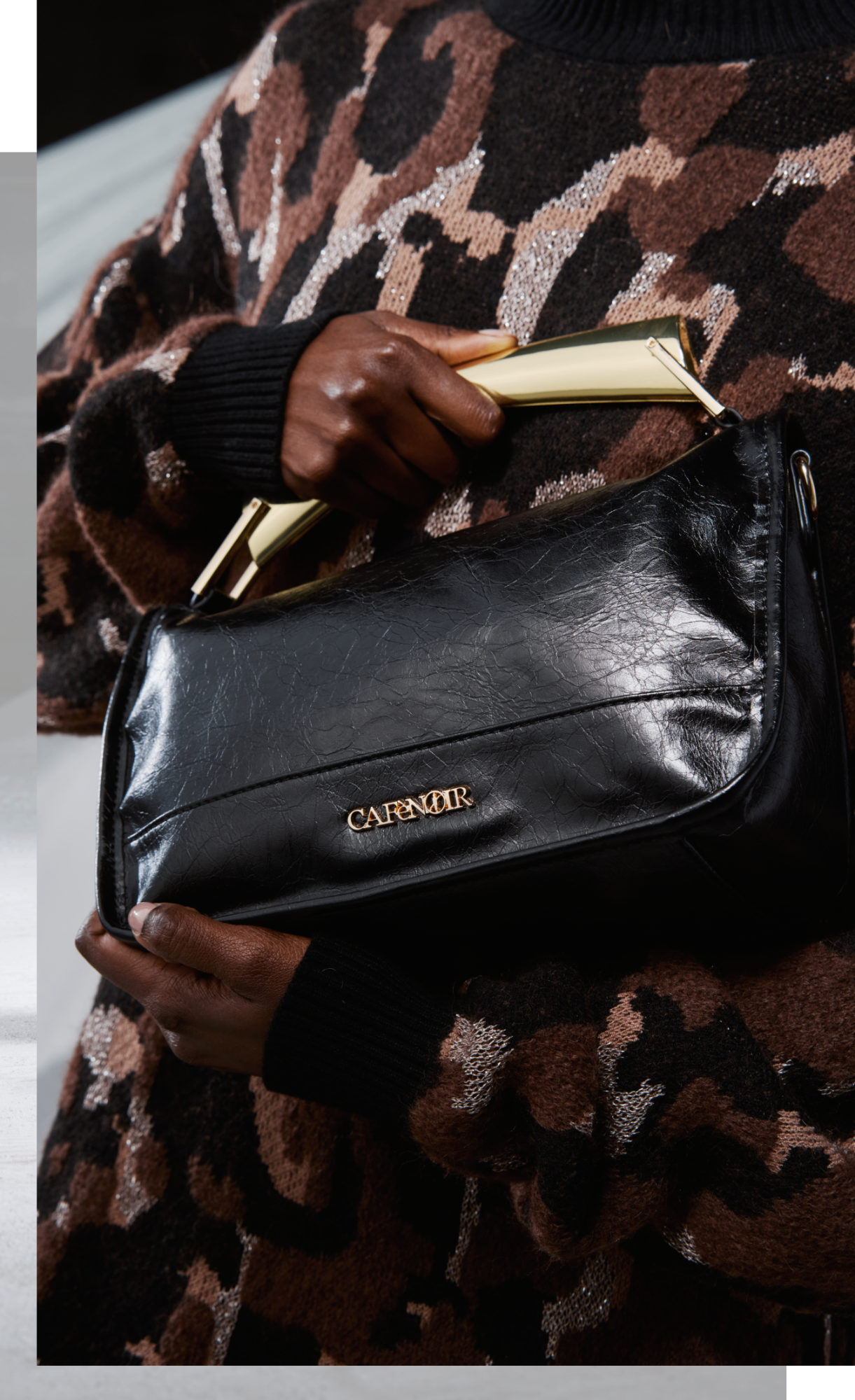 Animalprint-Texturen und dunkle Accessoires ergänzen sich in einem kraftvollen Gleichgewicht – perfekt für jede Gelegenheit.