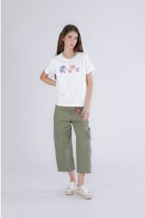 Damen-t-shirt aus elastischem baumwolljersey in regulärer passform. der halsausschnitt ist mit einem gerippten geschwungenen lurexsaum versehen die ärmel sind kurz. die vorderseite ziert ein floraler print und ein logo in zarten pastellfarben. das model ist 175 cm groß und trägt größe s. passform: normal.
