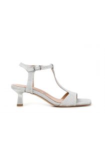 Sandalen mit eckiger Spitze und 50er Absatz, Oberschuh aus Lurex-Stoff, Futter und Innensohle aus Leder.
