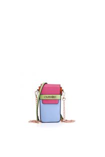 Handytasche mit mehrfarbigem überschlag. kettenförmiger schultergurt.