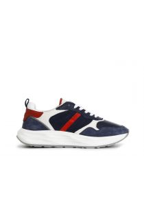 Mehrfarbige herren-laufschuh aus leder und stoff mit einer neuen sohle die sich durch ein wechselspiel von vertiefungen auszeichnet die den schuh einzigartig machen.