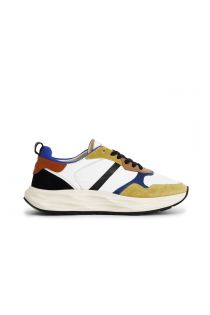 Mehrfarbige herren-laufschuh aus leder und stoff mit einer neuen sohle die sich durch ein wechselspiel von vertiefungen auszeichnet die den schuh einzigartig machen.
