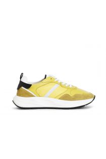 Mehrfarbige herren-laufschuh aus leder und stoff mit einer neuen sohle die sich durch ein wechselspiel von vertiefungen auszeichnet die den schuh einzigartig machen.