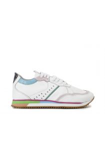 Mehrfarbige leder-sneaker mit superleichter laufsohle. leder in verschiedenen pastelltönen und unterschiedliche materialien vereinen sich zu einem vielseitigen und anmutigen modell einem wahren sinnbild des frühlings.