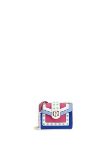 Mehrfarbige starre umhängetasche mit überschlag. goldenes cafènoir-logo auf dem überschlag. pyramidennieten und farbige kette.