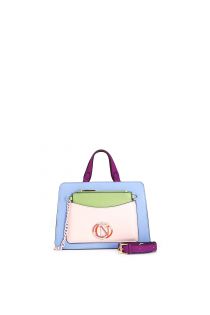 Starre mehrfarbige tragetasche mit emailliertem ovalem logo-accessoire. herausnehmbare tasche. verschluss mit reißverschluss. tasche mit schulterriemen.