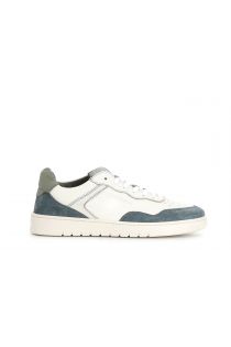 Mehrfarbiger freizeit-schnürschuh aus leder und rauleder mit dem oberschuh vernähte sohle.