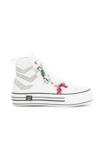 Mid sneaker aus stoff und glitzer angereichert mit einem bunten abnehmbaren accessoire.