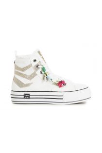 Mid sneaker aus stoff und glitzer angereichert mit einem bunten abnehmbaren accessoire.