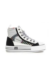 Mid sneaker aus einem patchwork von stoffen in grau- und schwarztönen. gummisohle mit einsätzen die auf das obermaterial und das logo abgestimmt sind.