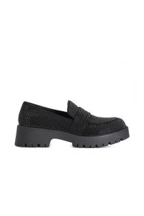 Damen-mokassin aus mikrofaser. oberteil mit mikro-strasssteinen besetzt. profilsohle aus gummi und 40 mm absatz.