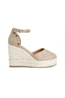 Mikrofaser-sandalen mit 10.5-cm-seilkeil und 3.5-cm-plateau. knöchelriemen. innensohle aus leder. schuh vorne und hinten geschlossen. goldene nieten oben und am riemen.