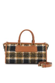 mini-tasche aus kariertem stoff mit geprägtem logo-schild tan