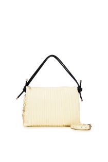 Minibag, Modell Coussin Bag, aus weichem Material mit charakteristischer wellenförmiger Plissierung und geknoteten Griffen in Kontrastfarbe, mit einem CafèNoir-Anhänger verziert