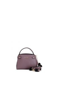 Minibag aus material mit gerb-effekt und metallverschlüssen. tasche zum tragen in der hand oder mit optionalem schultergurt mit bommel.