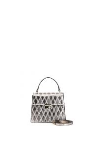 Steife minitasche in metallicfarben. rauten-patchwork. einzelnes fach und innentasche mit reißverschluss. druckknopfverschluss mit strass-accessoire. tasche mit schulterriemen.