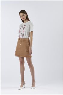 Minirock mit seitentaschen aus stretch bull denim-gewebe. sichtbare knöpfe. ausgefranster nahtloser saum.