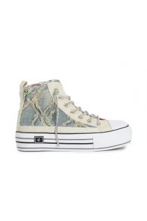 Mittelhohe sneakers aus ausgefranstem denim. strass-spitzenverschluss. 4-cm-kassettensohle mit farbigen details. schuhe die sich problemlos zu allen looks kombinieren lassen.