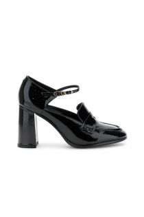 Damenmokassin aus lackleder mit riemen und personalisierter schnalle. 88 mm quadratischer absatz. die innensohle ist aus leder. sehr vielseitiger und schicker schuh um büro- und freizeit-looks stilvoll zu interpretieren.