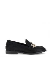 Schwarze Damen-Loafer in Ponyfelloptik mit elegantem, emailliertem Metallclip. Die Lederinnensohle und der niedrige 2-cm-Absatz sorgen für einen schicken und bequemen Look.