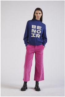 Pullover mit kragen im radfahrer-stil aus einem warmen und weichen angora-mischgarn. auf dem pullover ist unser slogan „be noir“ in einer kontrastfarbe abgebildet. eine zarte linie aus strasssteinen umrahmt die inschrift.