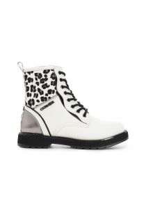 Multimaterial-Boots mit auffälligen Details in Leopardenoptik, Metall-Logo und verziertem Rahmen.