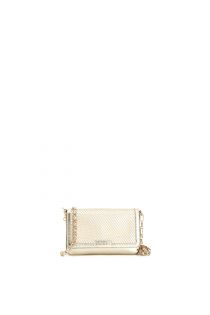 Clutch in laminierter netzoptik und strass. schulterriemen mit abnehmbarer fädelkette. magnetverschluss.