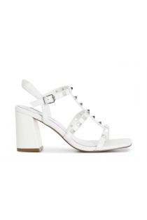 Ledersandalen mit silbernen nieten. verstellbares riemchen. innensohle leder. 75 mm hoher absatz.